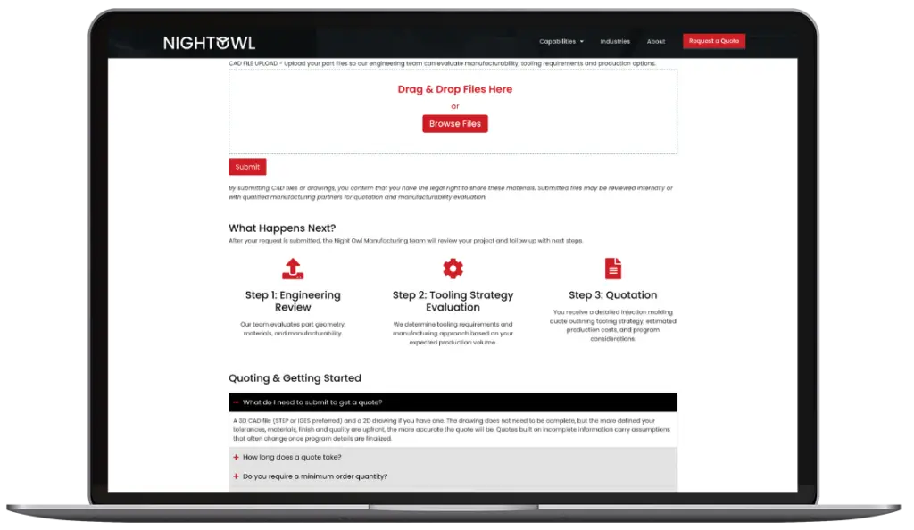 Night Owl Manufacturing supports companies that require a single manufacturing partner to manage injection molding programs from early engineering review through production delivery. Rather than acting as a transactional marketplace, we structure programs around long-term manufacturing success.